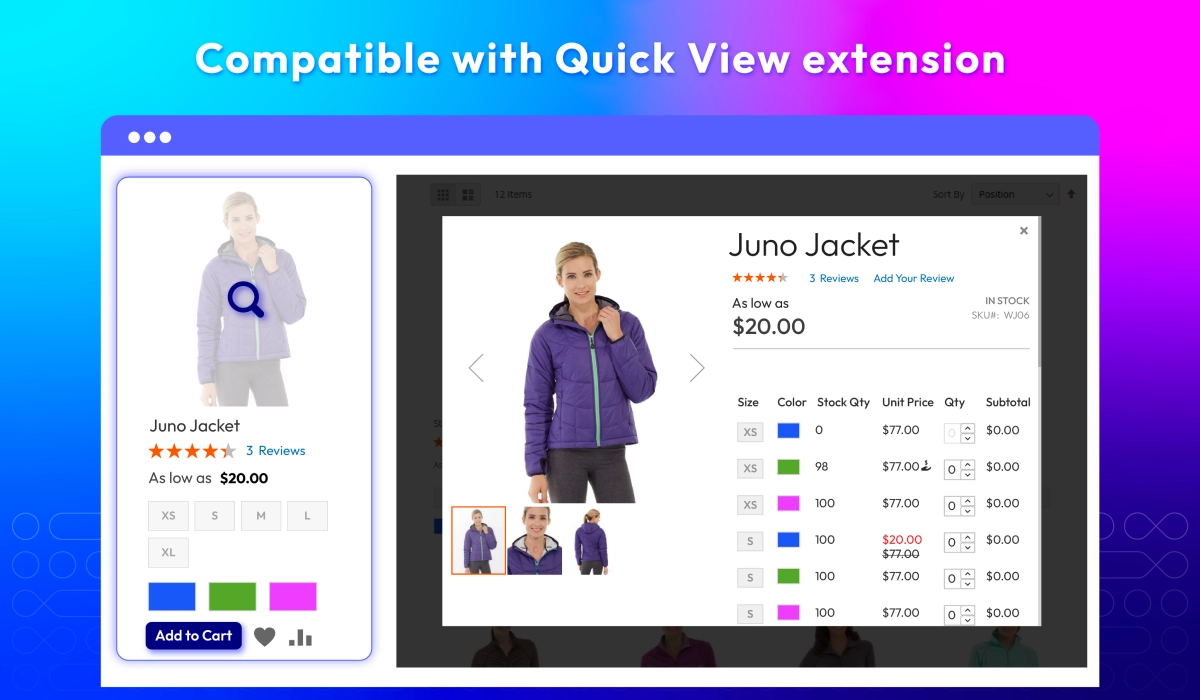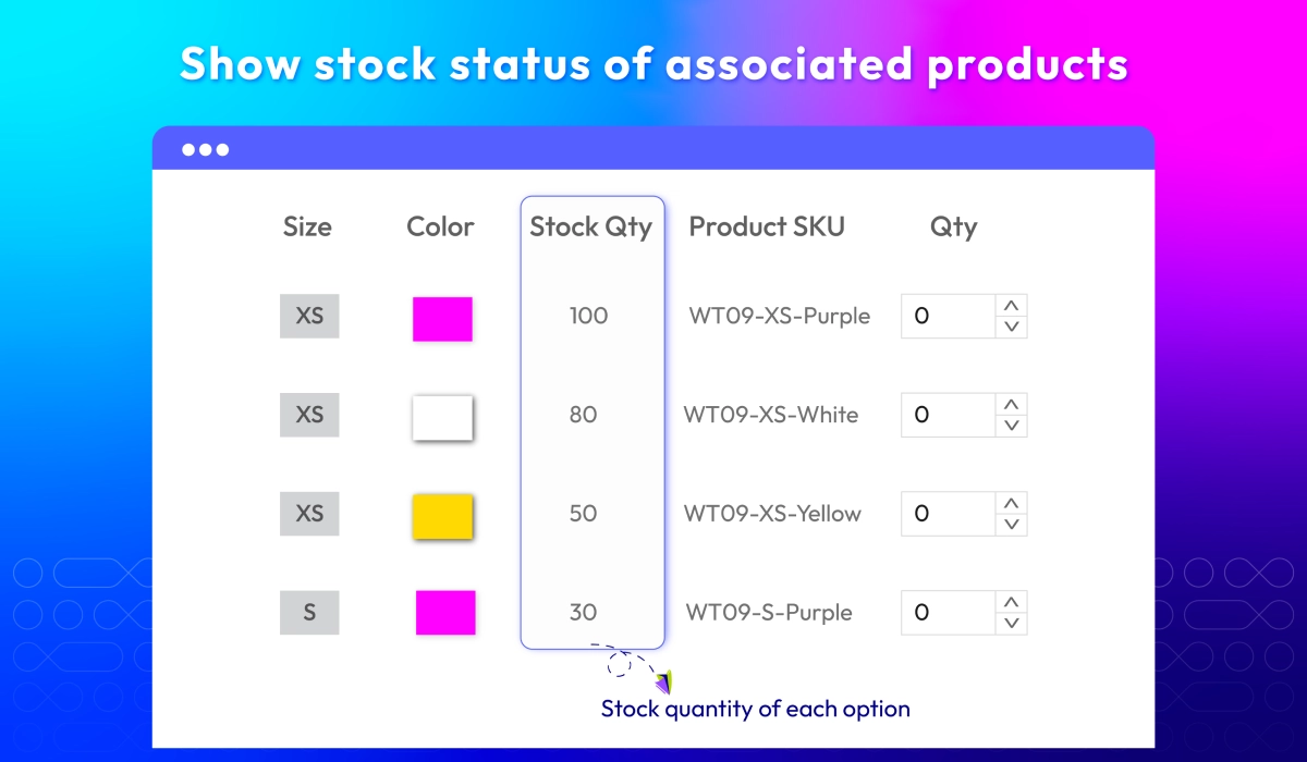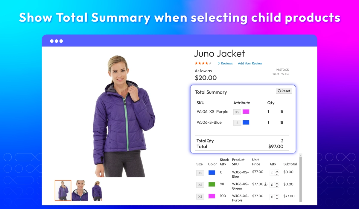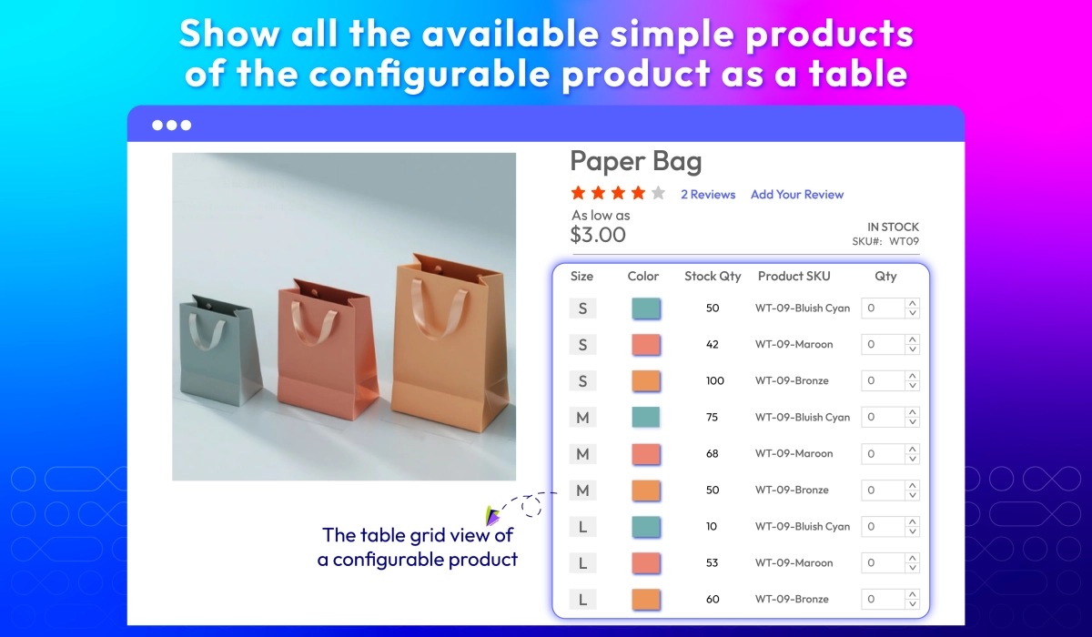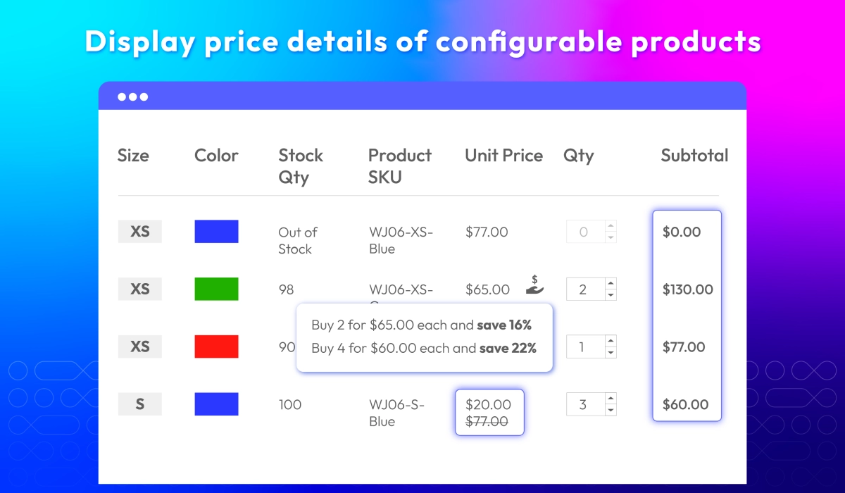 Simplify complex product selections by displaying all product variations in a clean, easy-to-navigate grid. Customers can compare options, add multiple variants to the cart at once, and review totals instantly, making bulk purchasing faster and more convenient.