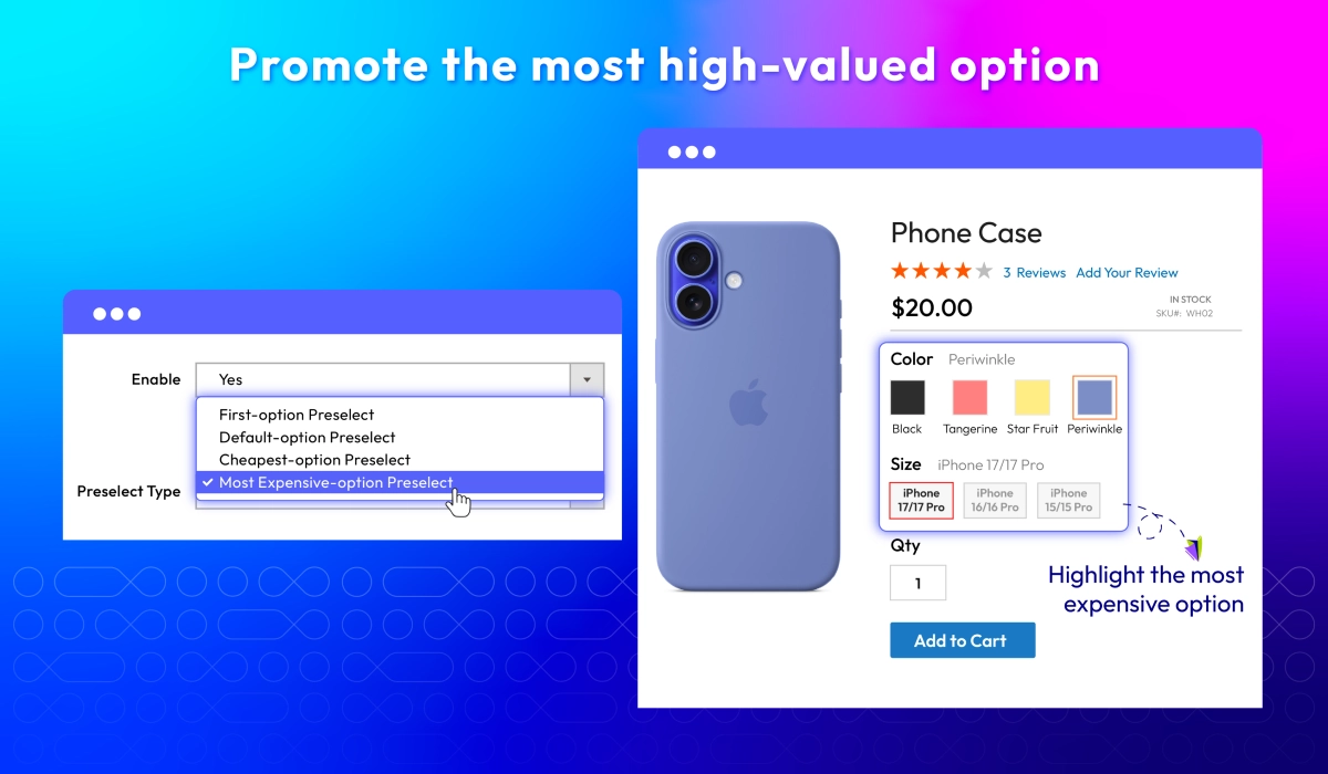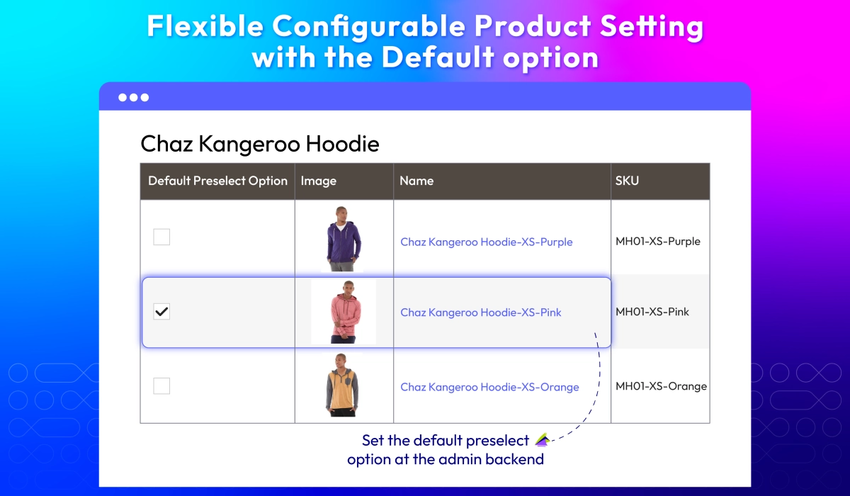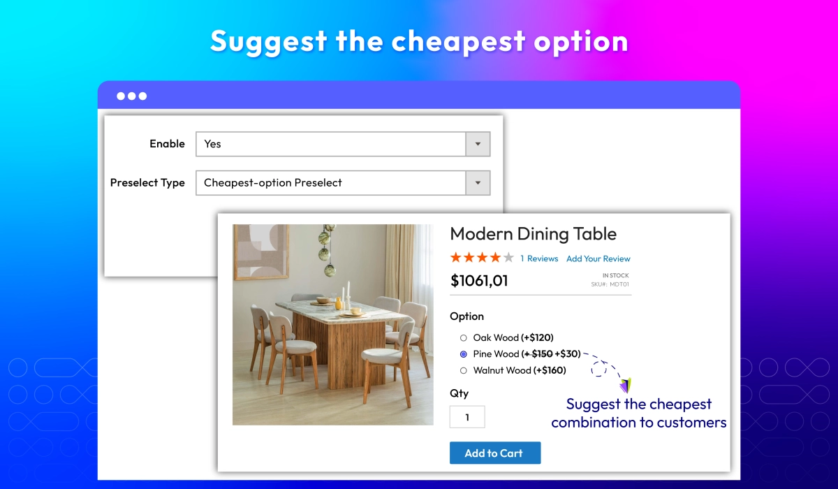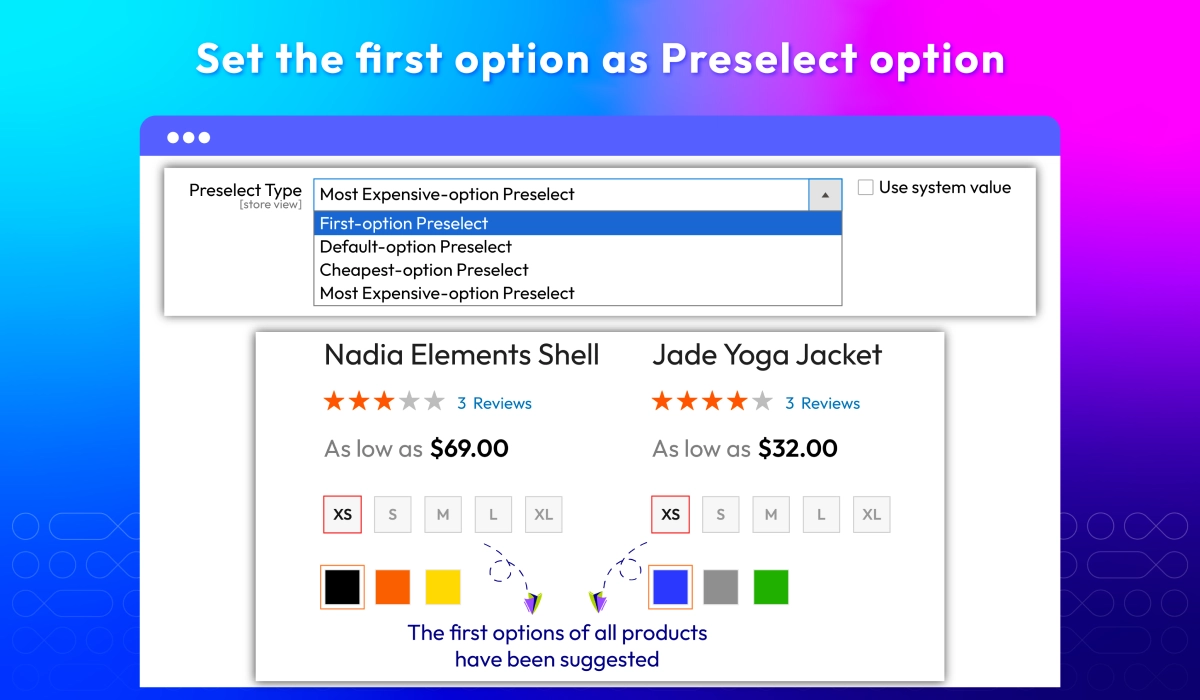 Magento 2 Configurable Products Preselect offer 4 preselect types including First-option Preselect, Default-option Preselect, Cheapest-option Preselect, Most Expensive-option Preselect