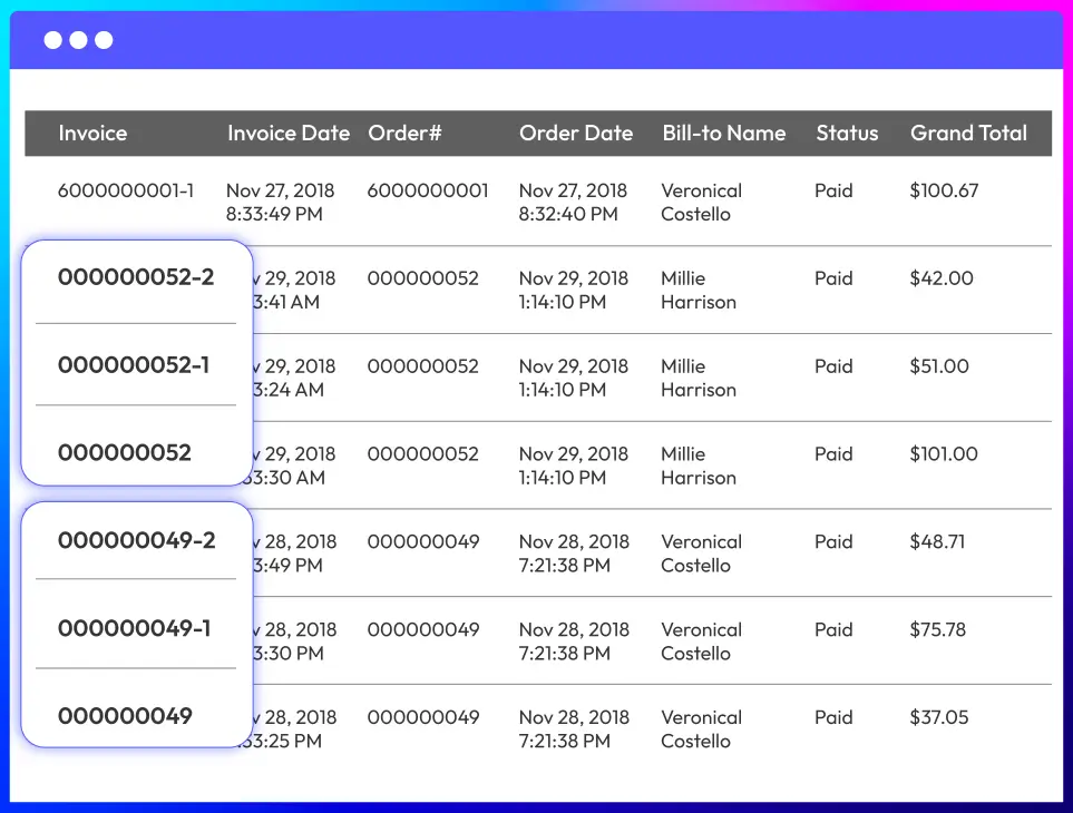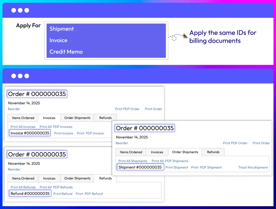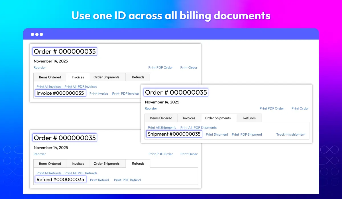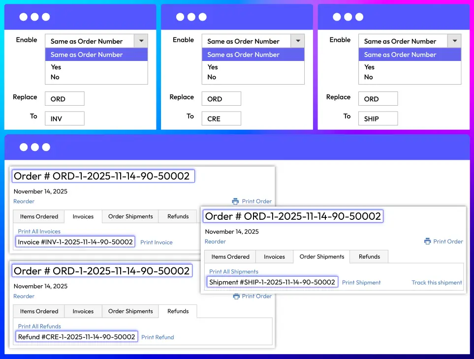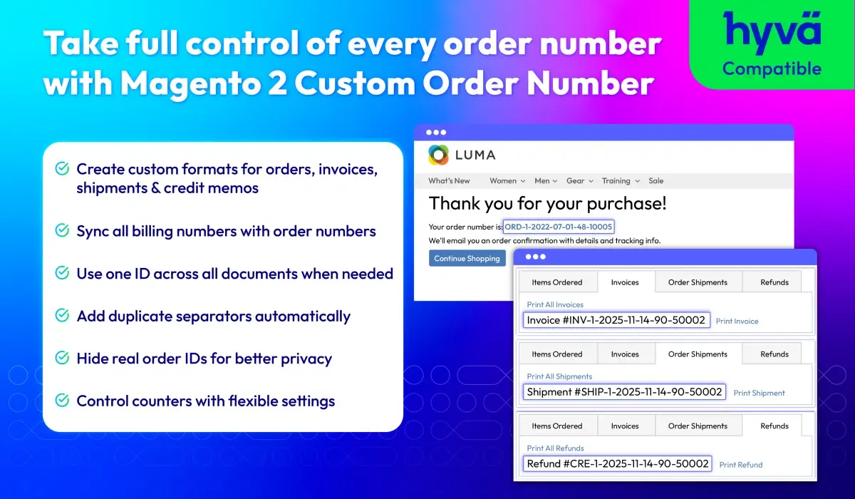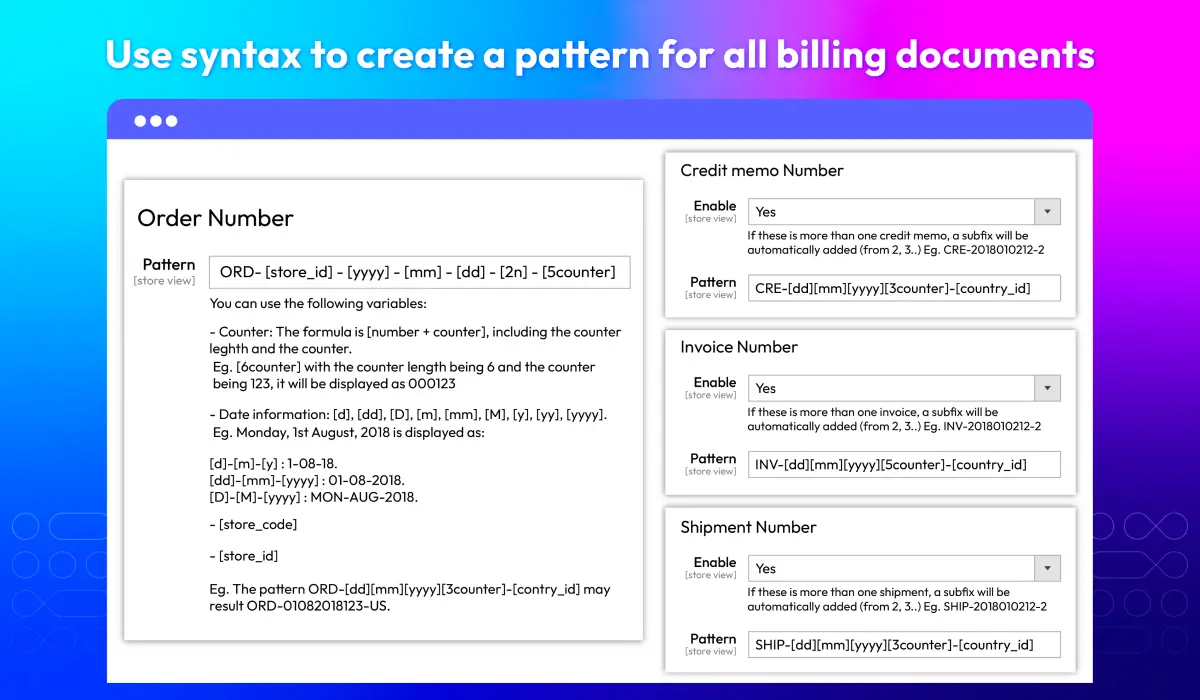 Yes. You can set a fully custom Magento 2 invoice number pattern with its own prefix, syntax, and counter—or choose to sync it with the order format for a consistent numbering system across your store.