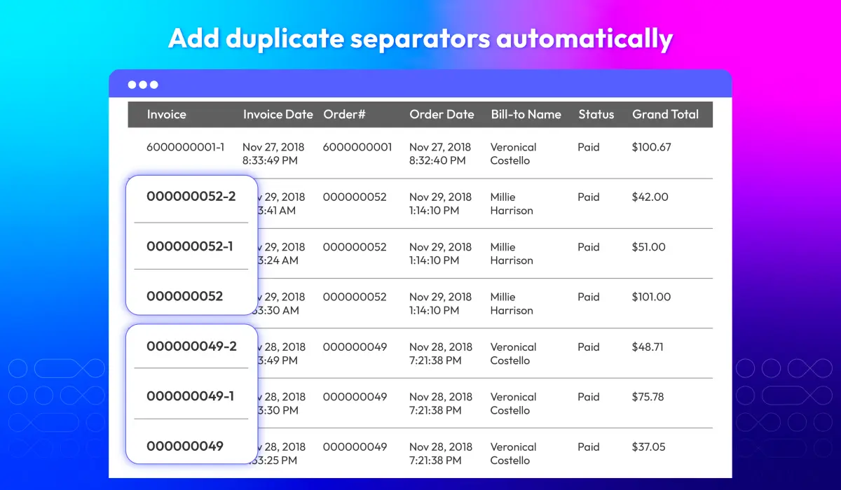 The extension automatically adds duplicate separators like 00100-1, 00100-2, etc. This groups related documents under the same base number while keeping each one unique for tracking and accounting.