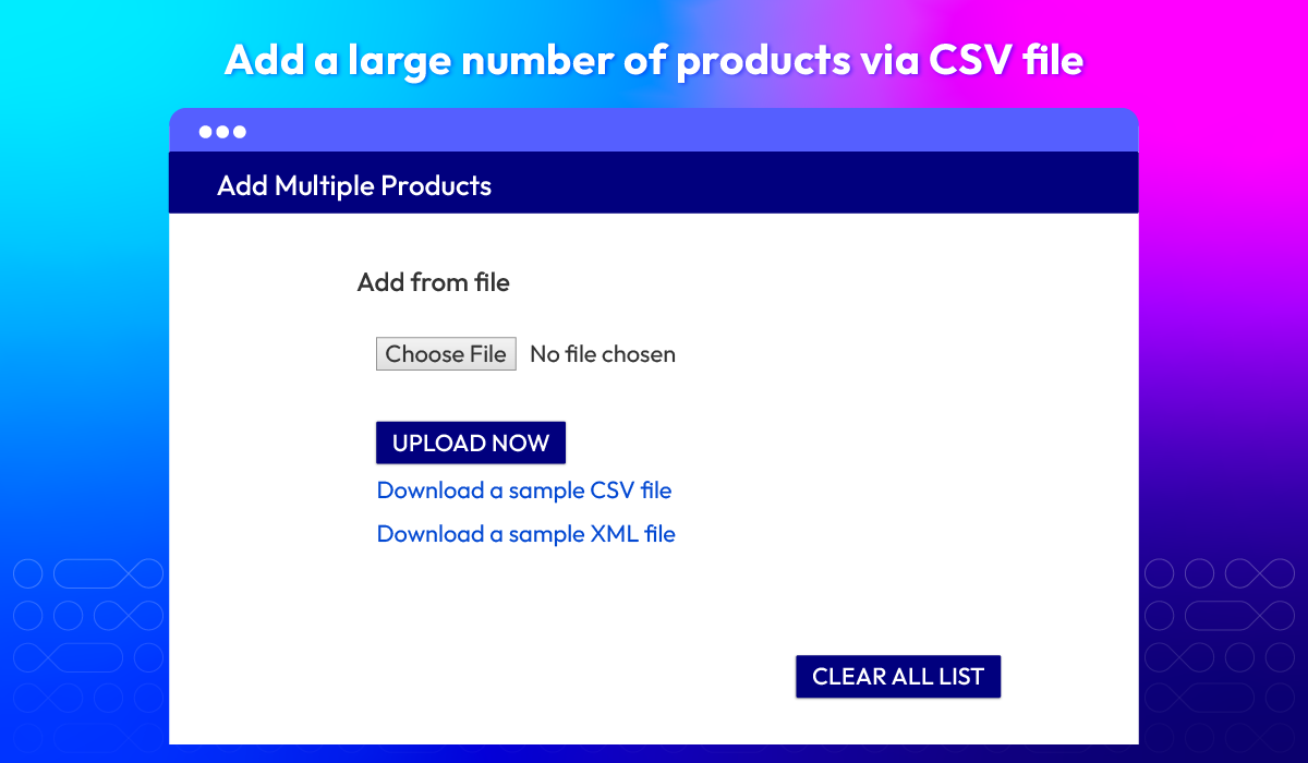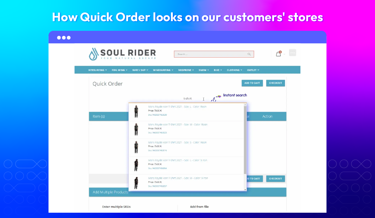 You can use instant search by product names or SKUs, add multiple SKUs or upload a CSV file.