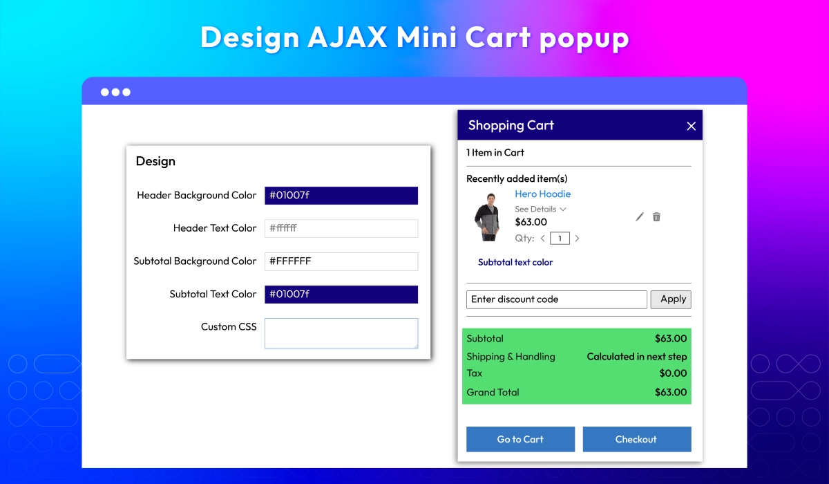 When shoppers click Add to Cart, Ajax Shopping Cart allows a mini cart to appear. Then they can adjust quantity, apply coupon codes, or use Reward Points and Gift Card then check the subtotal - all without being redirected to other page. When they turn off the pop-up, they can continue your shopping on current page.