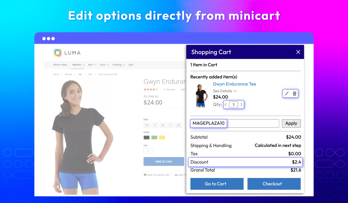 Using the mini cart in Magento 2 makes it easy for shoppers to review and adjust their order quickly. From editing product options to applying coupons within the minicart, checkout becomes faster and frustration-free.