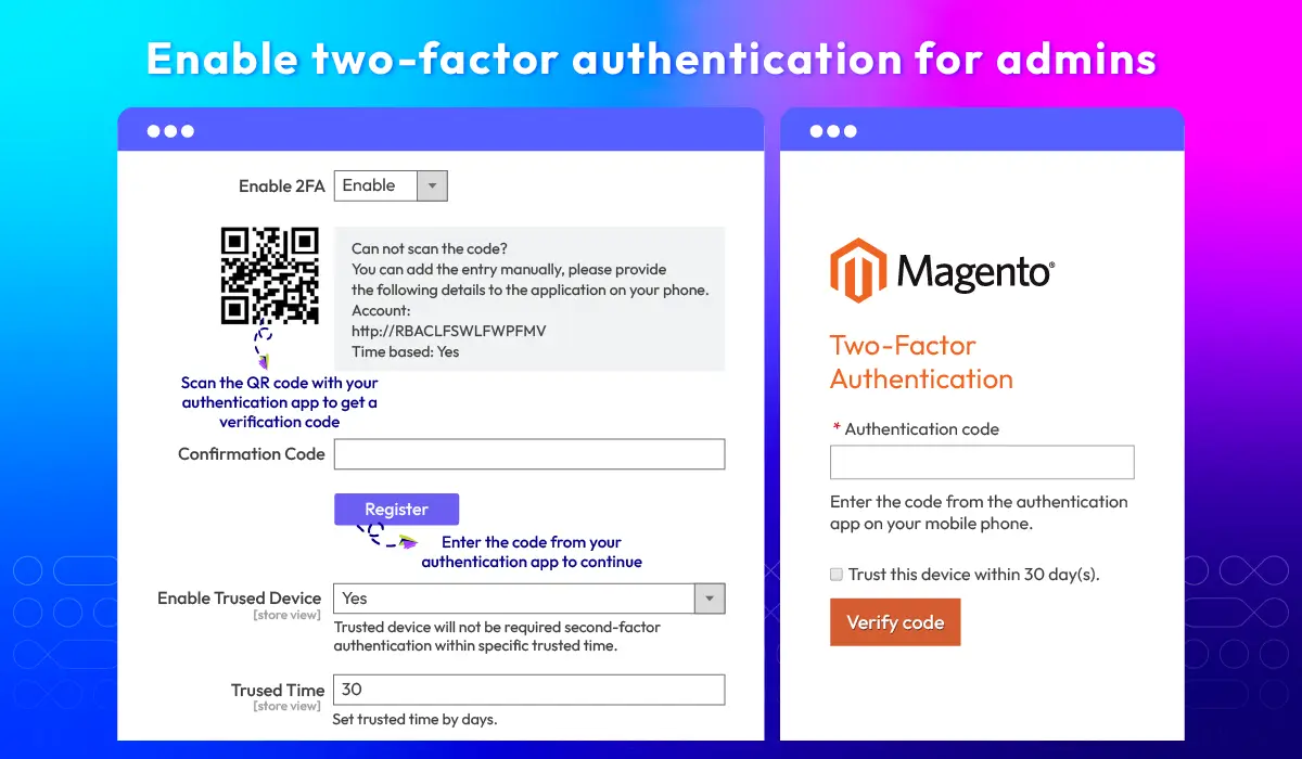 Add an extra layer of protection with two-factor authentication. Admin accounts remain protected even when passwords are compromised, reducing unauthorized access without disrupting daily workflows.