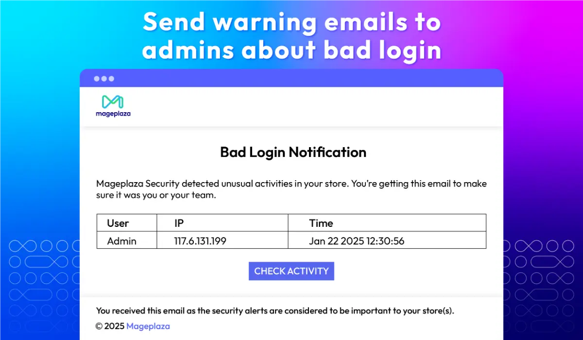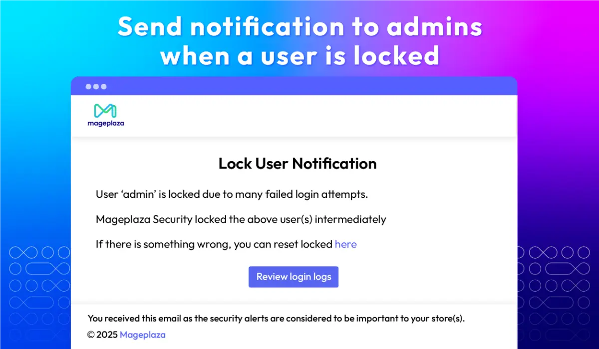 If you get locked out of your Magento 2 store, the module will automatically display all warnings of possible security risks and send messages to the email address. If you assume that this is a mistake, please follow our guide to unblock.