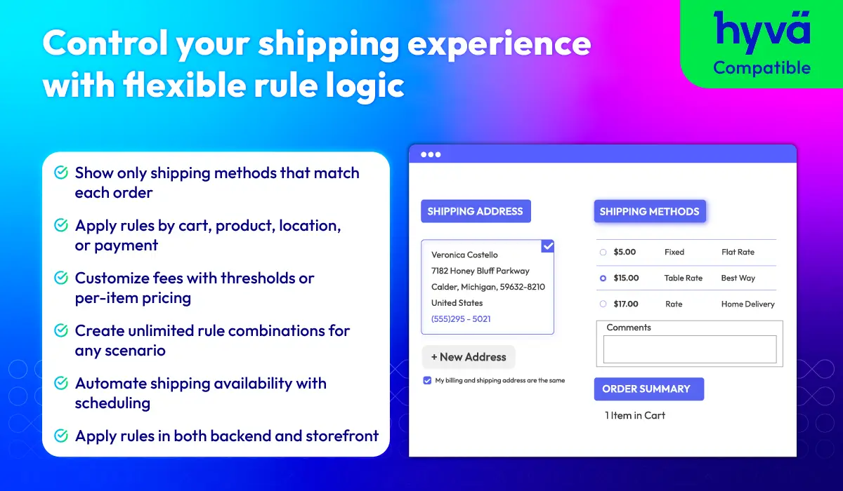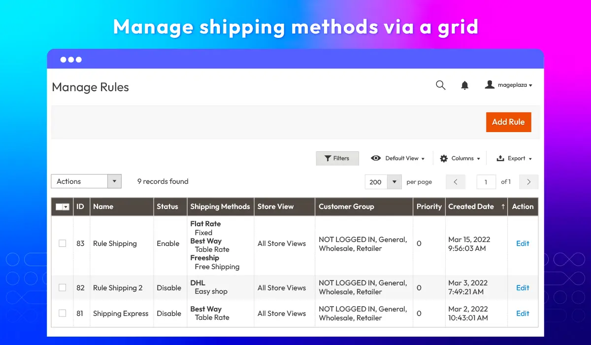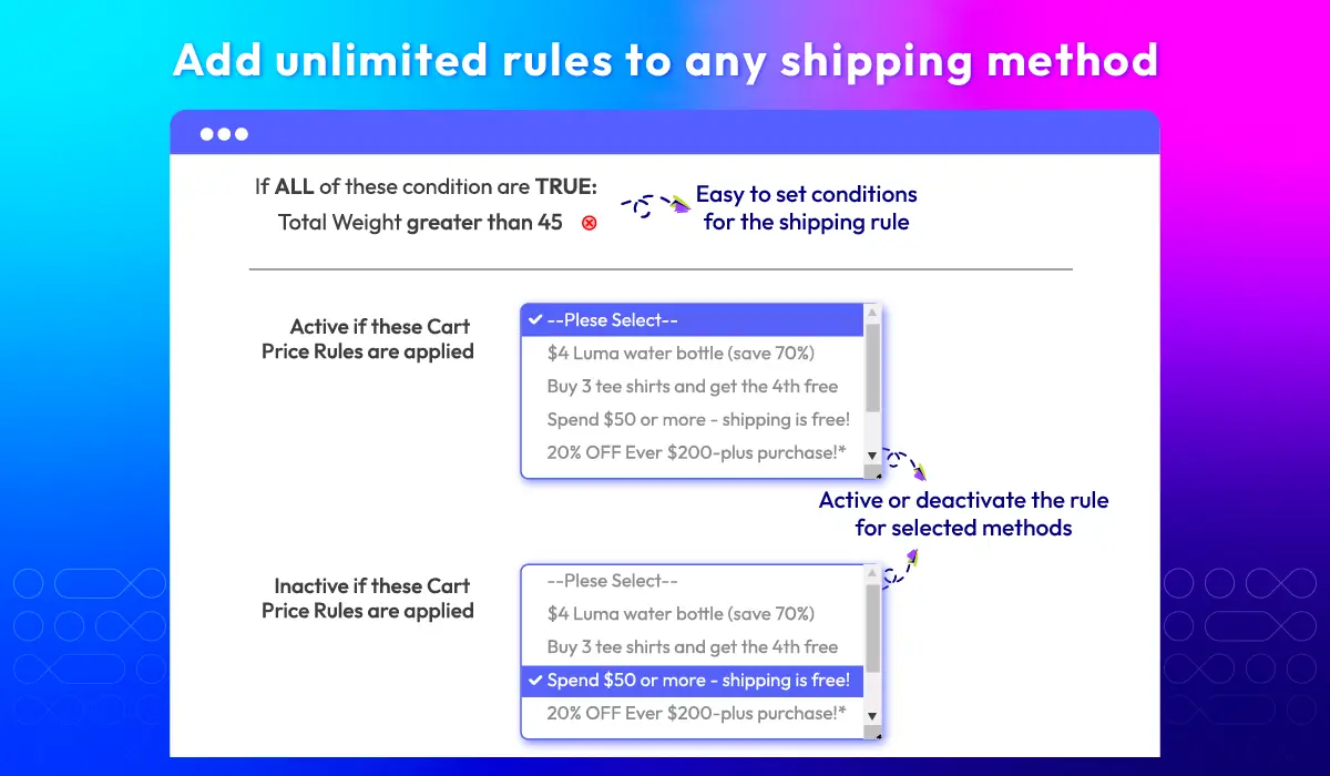 Go beyond Magento’s default shipping logic by combining flexible rules and custom fees. Instead of relying on basic conditions and fixed rates, you can fine-tune how each shipping method behaves to better match your business needs.